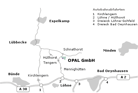 Die OPAL GmbH liegt verkehrsgünstig in der Nähe der Autobahnen A2 und A30. Folgen Sie der Ausschilderung in Richtung Hüllhorst. Circa 500 m nach dem Ortseingangsschild "Tengern" fahren Sie rechts in Richtung "Schnathorst / Nettelstedt" ab. Nach ca. 2 km biegen Sie rechts in das Industriegebiet "Schnathorst" (Bredenhop) ab. Dort sehen Sie sofort auf der linken Seite unser Firmengebäude.